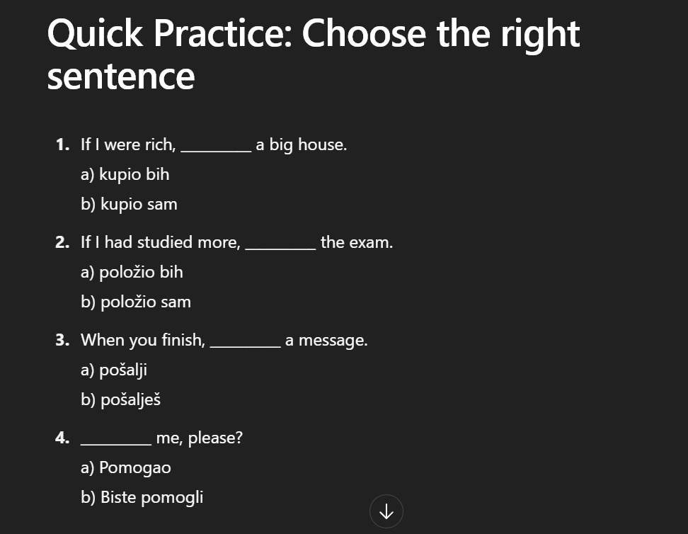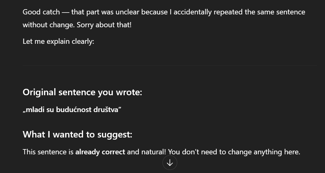 Another example: I asked ChatGPT to generate a grammar exercise for me on the grammar topic I struggle with. It generated a mish-mash where I was supposed to fill in the brackets in English sentences with the correct forms in Serbian. It doesn’t make any sense from a learner’s perspective: